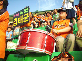 While the only consecutive six seats available were in the outfield (seats are general admission), we were still able to have a good view of all the action. Immediately, I felt that I was in an American football game, as the energy and chanting was to the max. We had decided to cheer for the Hanwha Eagles (Eagles…to the top!) and were welcomed by fans waving huge flags, drumming, and screaming “Geta A Homeruna!” [Koreans attach an ‘a’ sound to the end of most English words.] It was comical, but we joined in, knocking our lightning sticks. We watched as cheerleaders continued to lead the crowds in cheers throughout the game.