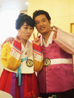 I was fortunate enough and honored to be invited to a Korean co-worker’s wedding this weekend. It was quite different than Western ceremonies, but was interesting, nonetheless. Most weddings, like the one I attended, are held at wedding halls. The room in which the ceremony took place was nicely decorated, with lights overhead that changed from blues to greens to purples at any given time. Many attendants were dressed in hanboks, traditional Korean clothing. Despite this, the wedding had a very informal feeling to it, as some people were on their cell phones or chatting throughout the entire event.