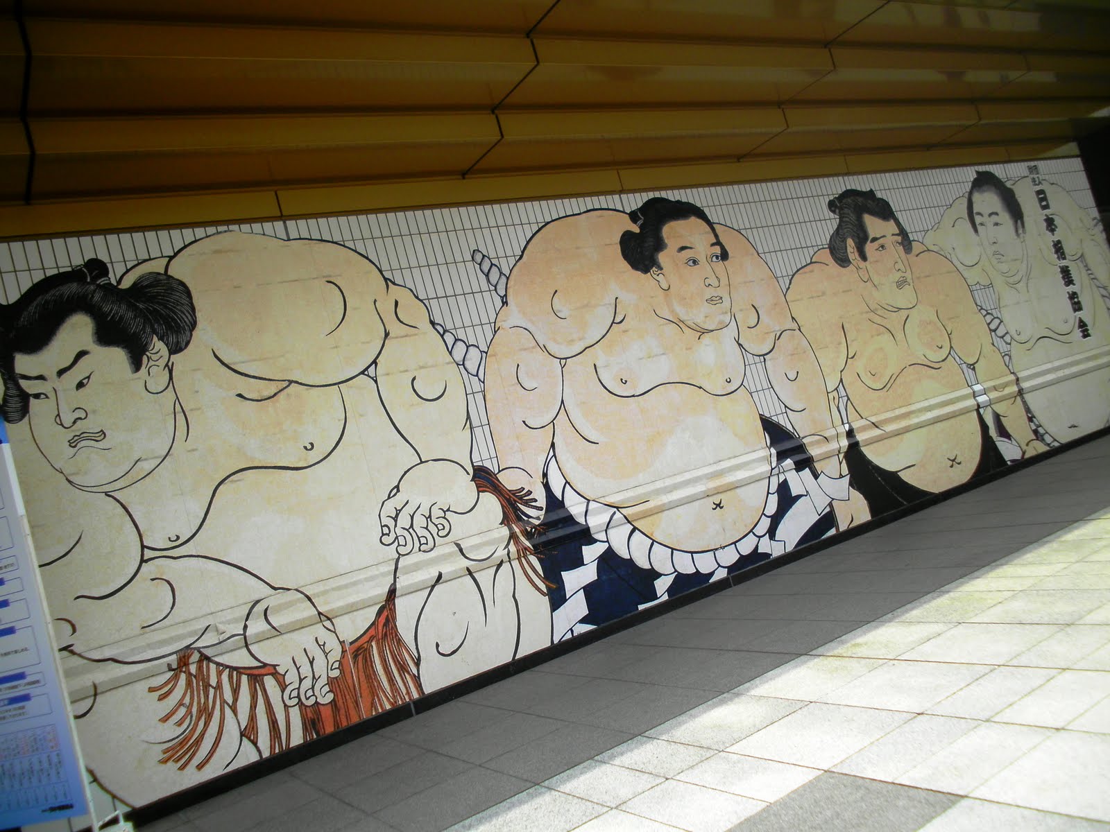 Murals depicting sumo wrestlers in traditional fashion at Kokugikan stadium.