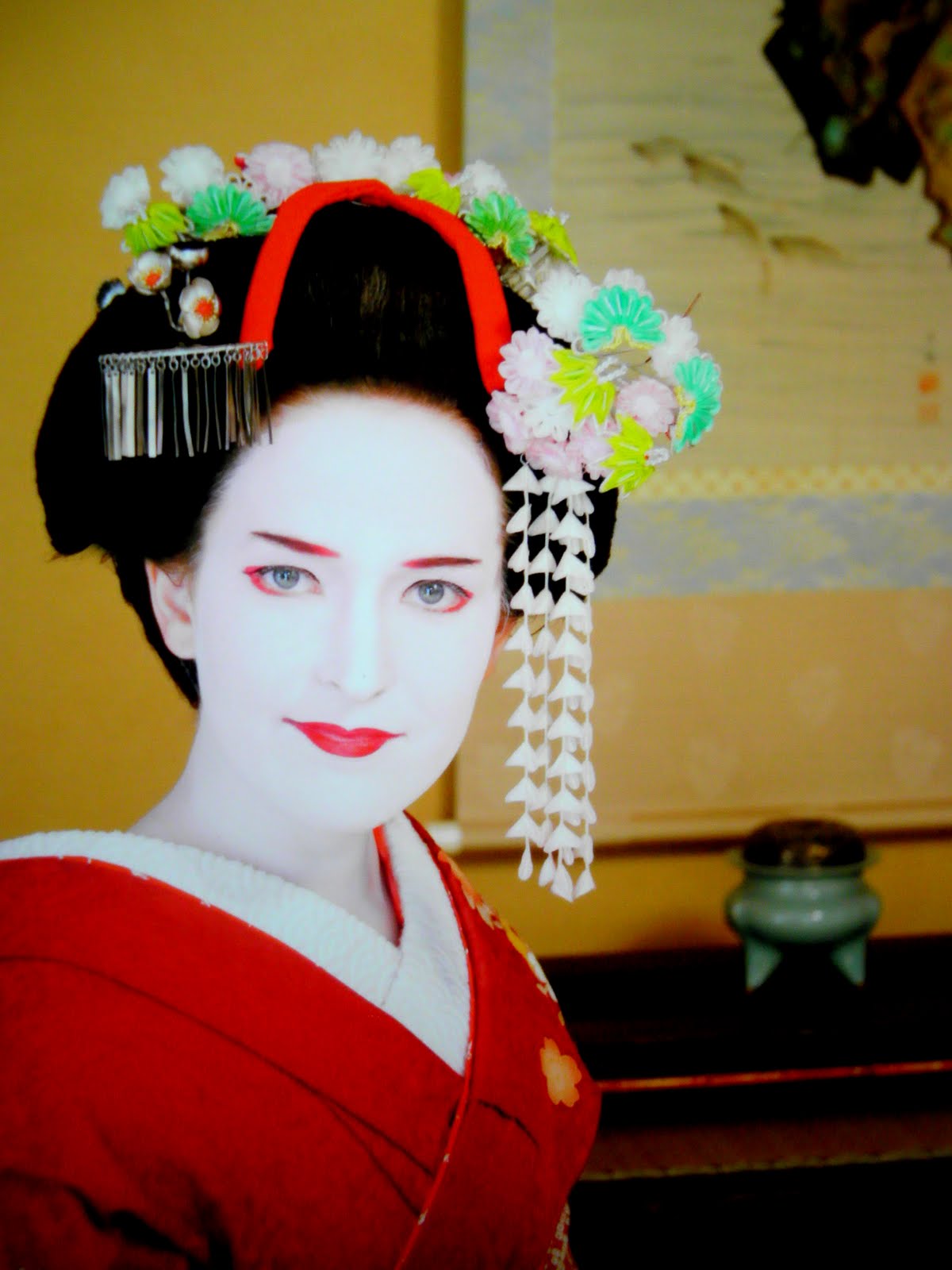 I headed into the makeup room where my geisha transformation began. My stylist, whose only English was read from a pre-printed script, first applied some baby oil and the iconic Neri-Oshiroi, or white powder, to my entire face and neck. Fortunately enough for me, the makeup is no longer lead or mercury based, as it once was in the olden days. The white face was creepy enough, but then she proceeded to darken my eyebrows in addition to lining my eyes with blacks and reds. She added a couple layers of red paint to my lips.