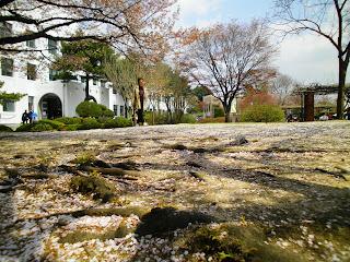 Cherry blossom “snow” covers the ground in front of the Jeongdok public library.