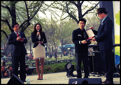 After receiving his plaque and a cool piece of graffiti art, the K-Supporters were brought up to the stage to be inaugurated. We took a photo with Lee Charm and Jay Park, bombarded with camera flashes from all directions. The event concluded with a performance from a Korean rock band who drew in passerby from the street with their electric music and powerful vocals. The KTO sure did a good job at throwing an awesome party and I look forward to more of them in the future.