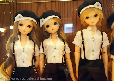 As soon as I walked into the cafe, I immediately noticed the floor-to-ceiling, wall-to-wall display cases of dolls. I crossed the hard wood floors to put my things down and after ordering a drink, I took another walk around to check out the displays. Upon closer inspection, I saw that the dolls’ features were almost identical to one another’s and exemplified the standard of Korean beauty: small faces, porcelain white skin, high noses, big eyes. Not only were the eyes big, but many of them were shadowed with a shade of brown which, when paired with a slight smirk or a pout created a look that could only be described as sinister. Their outfits did vary, from Victorian dresses, to sailor getups, to goth apparel, to… wait for it… sheer lingerie. Don’t get me wrong- the craftsmanship of the dolls was exquisite, but I couldn’t help but be a bit creeped out.