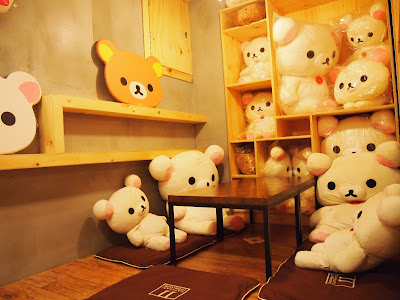 Upon entering the homey interior, customers are greeted by hundreds of stuffed Rilkkumas in addition to various memorabilia, all of which are for sale.  The layout of the cafe is quite unique; seating options include comfy couches, tables perfect for studying, and floor mats in cozy, private spaces, most of which were occupied by gossiping girls on my latest visit.  Rilakkuma is incorporated into every aspect of the decor and the entire place oozes with comfort and cuteness.  The employees were also cute, making and serving my green tea latte with great care.  They later brought out “service” (free) snacks, which made me like the place even more.  I couldn’t find anything I didn’t like about Capi Capi, though I will be staying away from their “Ice Dog Bread”: a hot dog bun filled with whipped cream.