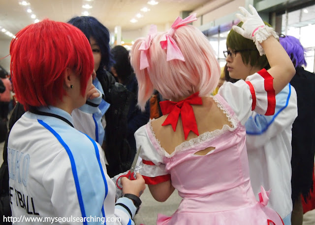 When I arrived at the SETEC center in southeastern Seoul, I knew I was in the right place. Despite the sleety, gloomy weather, the comic-loving crowds were out in full force. Participants, most of whom were teenagers, gathered in crowds, laughing, talking manhwa, and some even wearing costumes. Yes, the costumes. It was what most excited me when visiting the Harajuku district in Japan and it was what I was most looking forward to at Comic World. Many of the costumes I would see throughout the entirety of the day were extremely creative and it was obvious that the costumed kids put a lot of effort into their outfits. I didn’t know who most of them were supposed to be, as I know little to nothing about animation, but I appreciated their hard work and creativity.