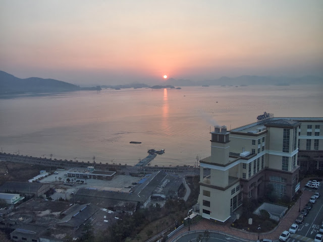 I slept well in my comfortable and toasty room and set my alarm to catch the sunrise.  Fortunately, the window of my room provided an incredible view of the ocean so I stayed tucked in bed and sipped hot green tea as I watched a blazing red sun arise from mountains dotting the distant horizon.  I would have been happy spending all afternoon in my room or in the gorgeous spa the hotel boasts but it was on to Jinju, so I packed up my bags, gorged on a tasty Western breakfast, and said goodbye to Yeosu.