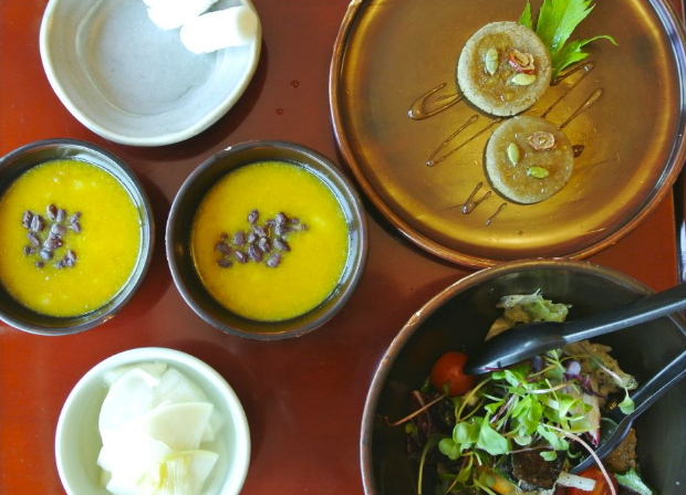Adorned with minimalist furnishings in natural color schemes and surrounded in floor to ceiling windows which let in plenty of light, Barugongyang exudes a relaxing atmosphere. On the menu is a variety of mid-range to expensive pre-fixed seasonal course meals, each offering up an eclectic sampling of dishes commonly found in formal monastic meals such as dwenjang (bean paste) soup, lotus leaf rice, seasonal salads and fermented vegetables.