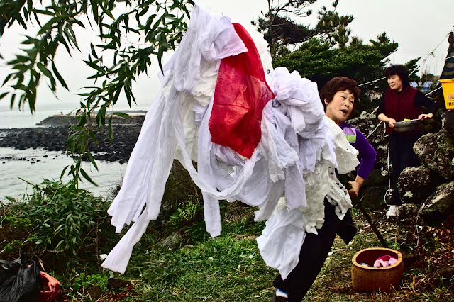 I really like the myth of Miss Hyun’s shrine on the southeastern side of the island. Miss Hyun, unlike many of Jeju’s deities, is a young goddess, not a grandmother goddess. She was an actual person, a village shaman, who lived several hundred years ago. It is said that she died of grief after discovering her brother’s corpse on the nearby beach. He had returned to Jeju from the mainland with a ceremonial dress for her but then shipwrecked. Today, villagers still hang ceremonial dresses for Miss Hyun in a tree in her shrine. You can see these dresses in some of the photos I included from the book.